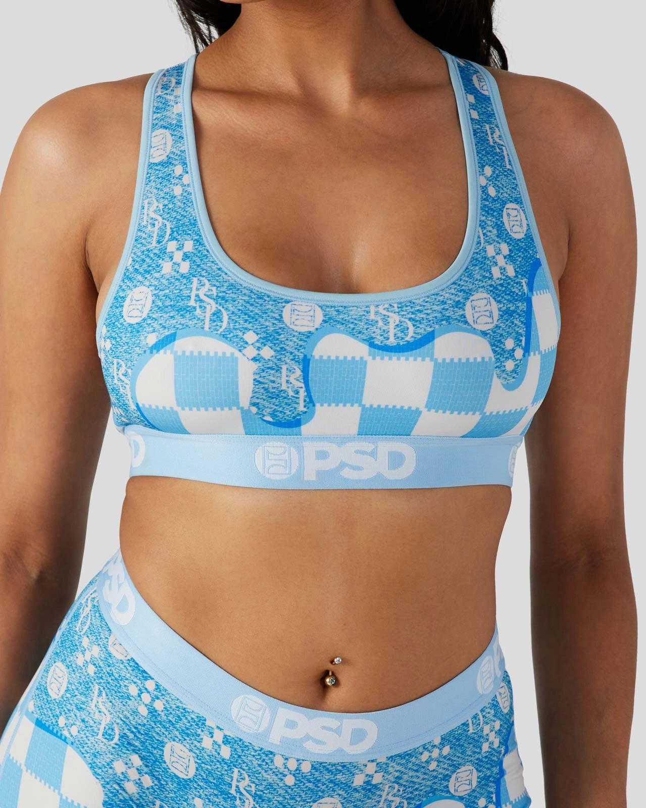The Blue Denim Drip Sports Bra features a luxury-inspired print dripping onto blue and white checkers. Made from a silky poly blend. the PSD sports bra is breathable yet slightly compressive. bringing you the comfort and support you need for everything you get into. This style is available in sizes XS – 5XL.