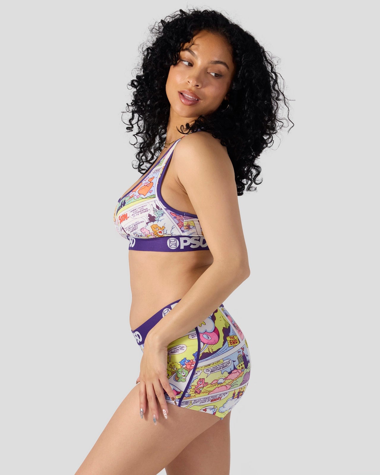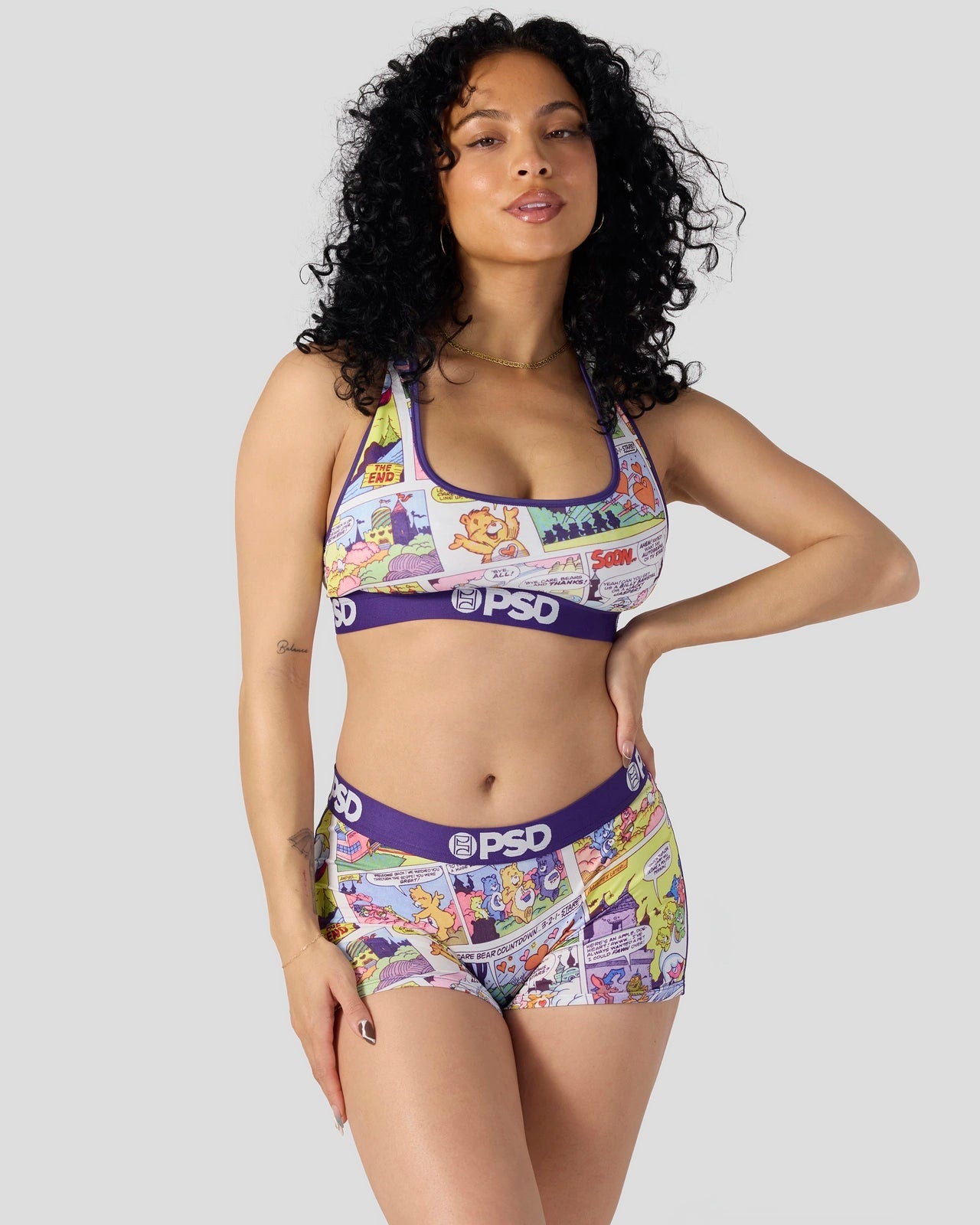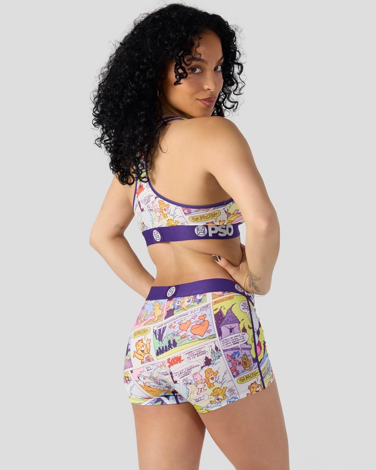 New from Care Bears x PSD! Featuring a comic strip design. the Comic Boy Short is made from a silky poly blend with a comfortable full coverage. keep-you-in fit. The PSD boy shorts are perfect for everyday wear and working out.